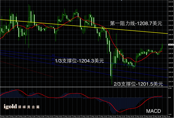 黄金阴阳烛录得回落后末端阳烛反弹,后期处于红色日均线中位,短线MACD显示呈中性,黄金价格上午或浮动在1206美元附近,并偏于小幅上探1208美元附近,低位空头若跌破1205美元附近,或向1203美元附近下探。