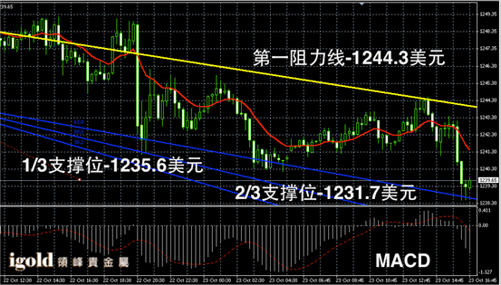 黄金阴阳烛录得后期阴烛增多,且低于红色日均线,短线MACD显示空头增加,黄金价格多空不稳,晚上建议密切留意1239美元这一支撑位,若美指攀升金价跌破这一位置,新的下线空间或打开,持稳则偏于回升至1243美元附近。