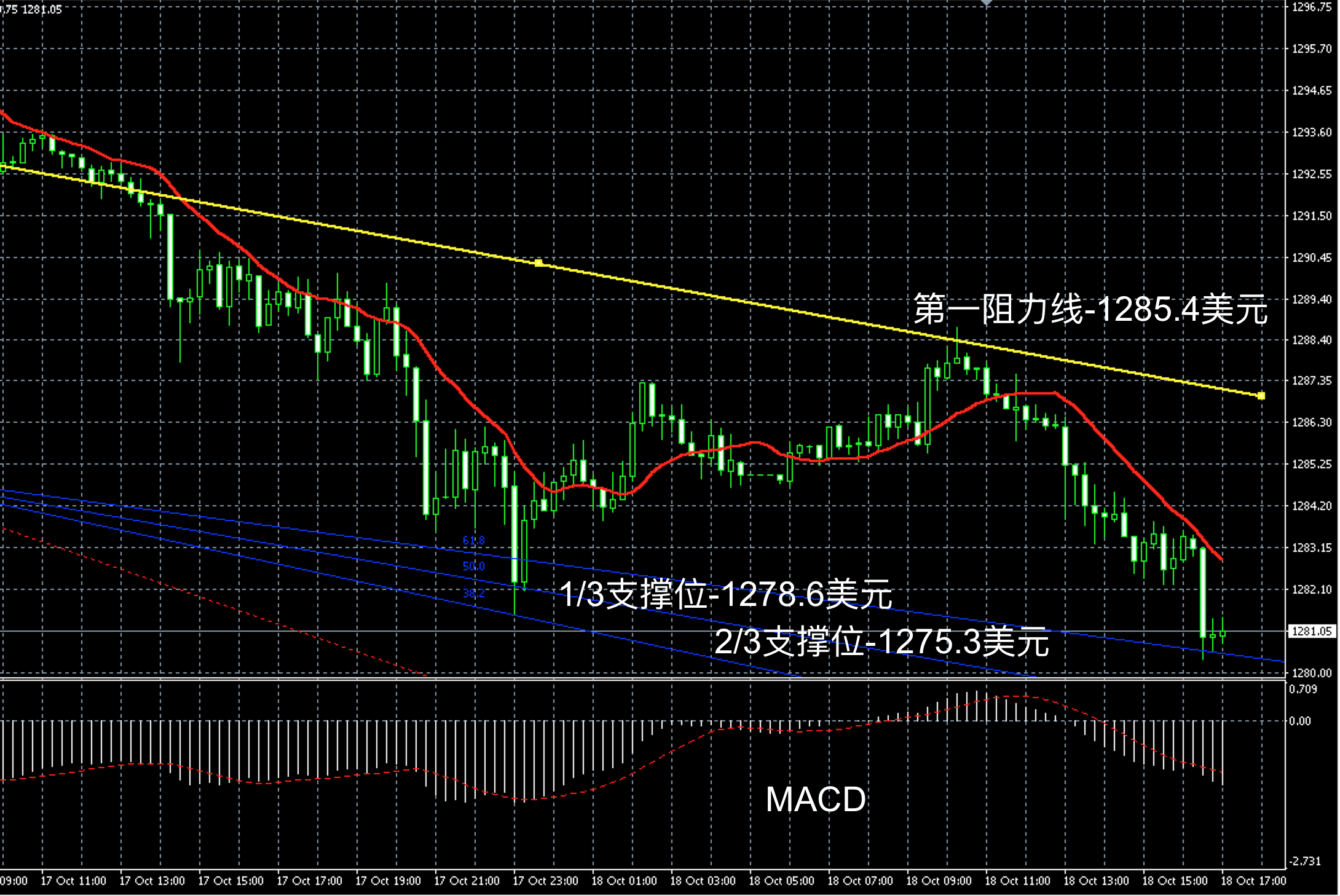 黄金阴阳烛录得小幅回落,末端小幅低于红色日均线中位,短线MACD显示弱势空头主导,黄金价格晚上或在1281美元附近持稳,高低多空扩大信号可分别参考1283.5和1278.6美元附近,高低若有突破可顺势看涨看跌2-3美元左右,低位若跌破1280美元附近支撑,空头或进一步增加。