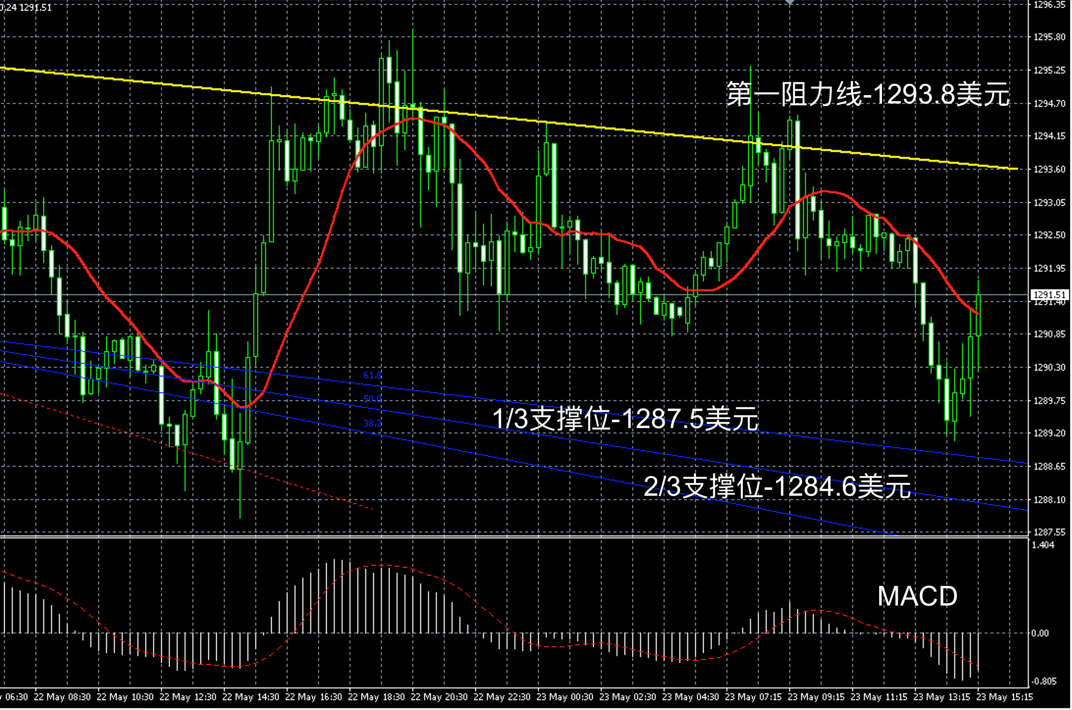 黄金阴阳烛录得区间回落,末端低于红色日均线中位,短线MACD显示呈中性,黄金价格晚上或在1291美元附近徘徊,高低多空扩大信号可分别参考1293.2和1288美元附近,高低若有突破可顺势看涨看跌2-3美元左右。短线若不能持稳在1290美元以上,市场或继续偏空震荡。