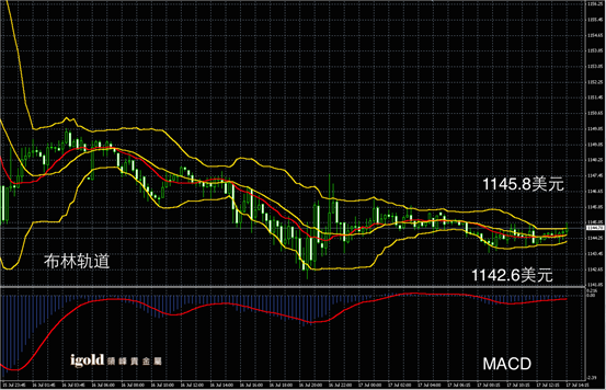 黄金阴阳烛录得柱体聚焦在红色日均线中位,布林轨道区间收窄,短线MACD显示呈中性,黄金价格午后或小幅上探1145美元附近,高低多空信号可参考1148和1142美元附近。
