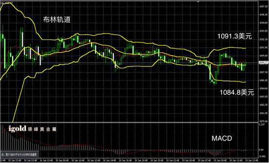 黄金阴阳烛录得反弹后柱体收短,后期处于红色日均线中位,短线MACD显示呈中性,布林轨道区间扩大,黄金价格下午或继续在图中所注释的布林轨道区间内弱势运行。