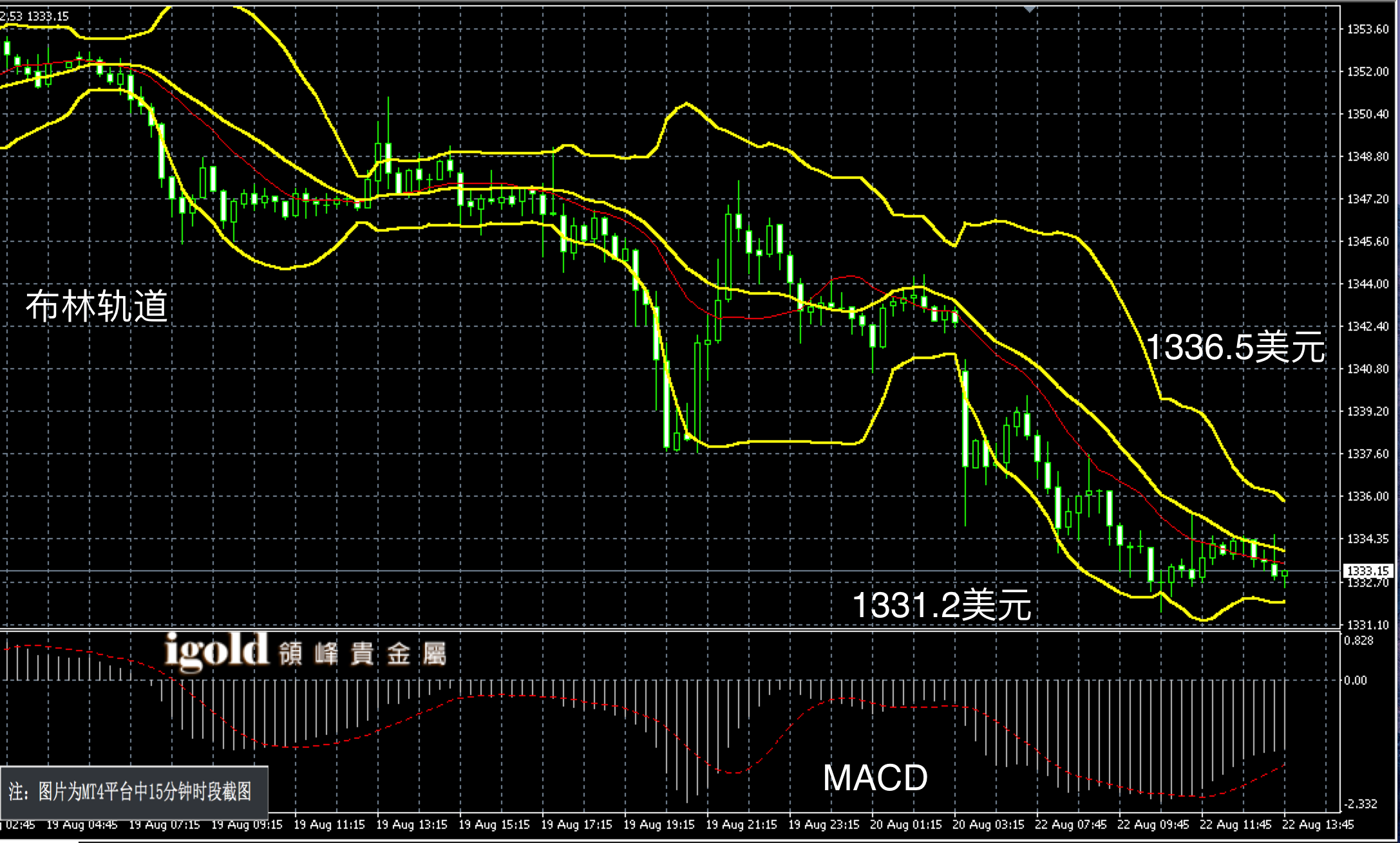 黄金阴阳烛录得下行后柱体收短,末端处于红色日均线中位,短线MACD显示弱势空头主导,布林轨道区间下探,黄金价格下午或在1333美元附近弱势盘整,高低多空扩大信号可分别参考1336和1331美元附近。