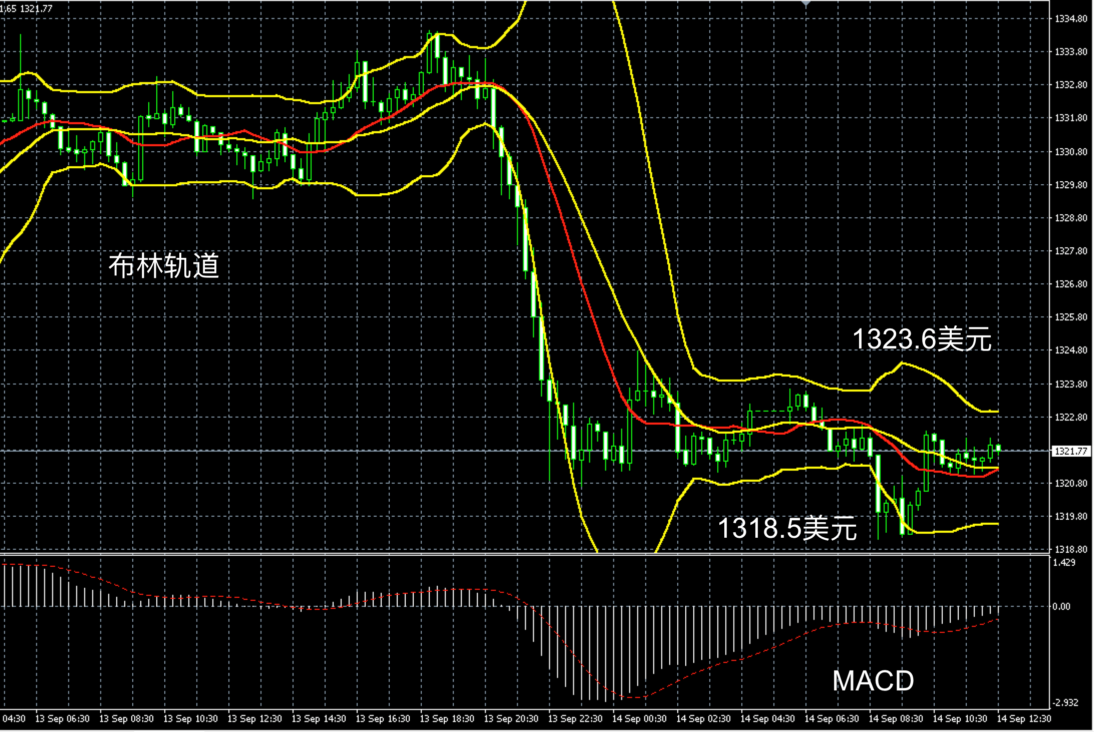 黄金阴阳烛录得下行后柱体收短,末端处于红色日均线中位,短线MACD显示呈中性,黄金价格下午或在1321美元附近小幅上探,高低多空扩大信号可分别参考1323.5和1319.4美元附近。