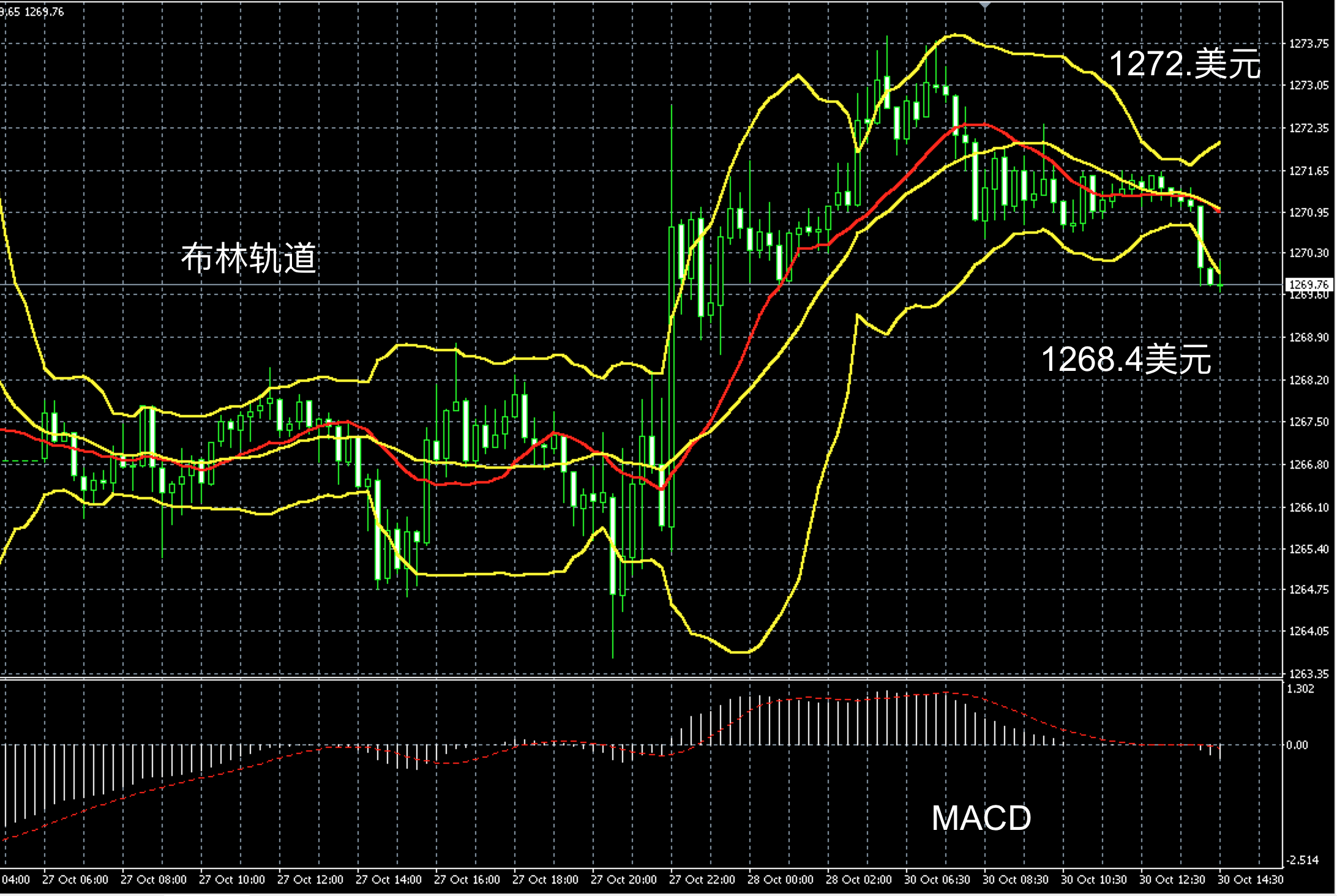 黄金阴阳烛录得小幅回落,末端低于红色日均线中位,短线MACD显示呈中性,布林轨道小幅承压,不过上线有所反弹,黄金价格下午或在1270美元附近持稳,高低多空扩大信号可分别参考1272.3和1268美元附近。
