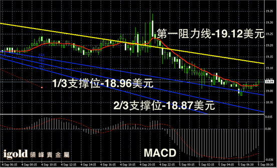白银阴阳烛录得末端阳烛出现,且高于红色日均线,短线MACD显示空头主导,白银价格上午或小幅上探至19.1美元附近。