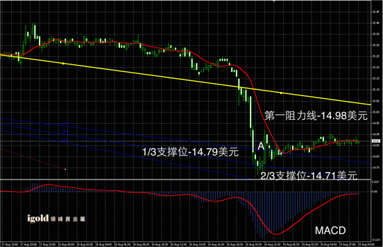 白银阴阳烛录得柱体回落后持稳,末端处于红色日均线中位,短线MACD显示弱势空头主导,白银价格短线存在回调动能,短线运行区间可参考阳烛A的高低价,高位若突破14.9美元附近或再次回升至15美元以上,低位空头扩大信号可参考14.75美元附近。