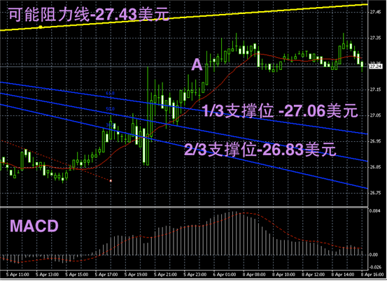 白银阴阳烛录得趋势较为平缓,不过末端柱体连续录得阴烛出现,且短线MACD录得DIF线正不断收短,预期未来或偏空窄幅下行,低位支撑可首先参考阳烛A的最高价,若跌破或继续下行。