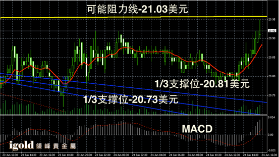 白银阴阳烛录得柱体较为平稳,阴阳烛间隔出现,且平均分布在红色日平均移动线中位,短线MACD显示呈中性,不过末端录得阳烛增多,白银价格短线或冲击21美元线。