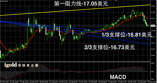 白银阴阳烛录得反弹后,后期阴烛回落,末端柱体低于红色日均线,短线MACD显示呈中性,白银价格或继续在16.8-17.05美元区间横盘运行。高低若有所突破,可顺势看涨看跌。