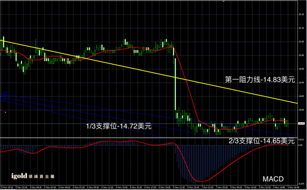 白银阴阳烛录得柱体较短,整体聚焦在红色日均线中位,短线MACD显示呈中性,白银价格晚上或在14.75美元附近横盘震荡,高低多空信号可参考14.8和14.65美元附近。