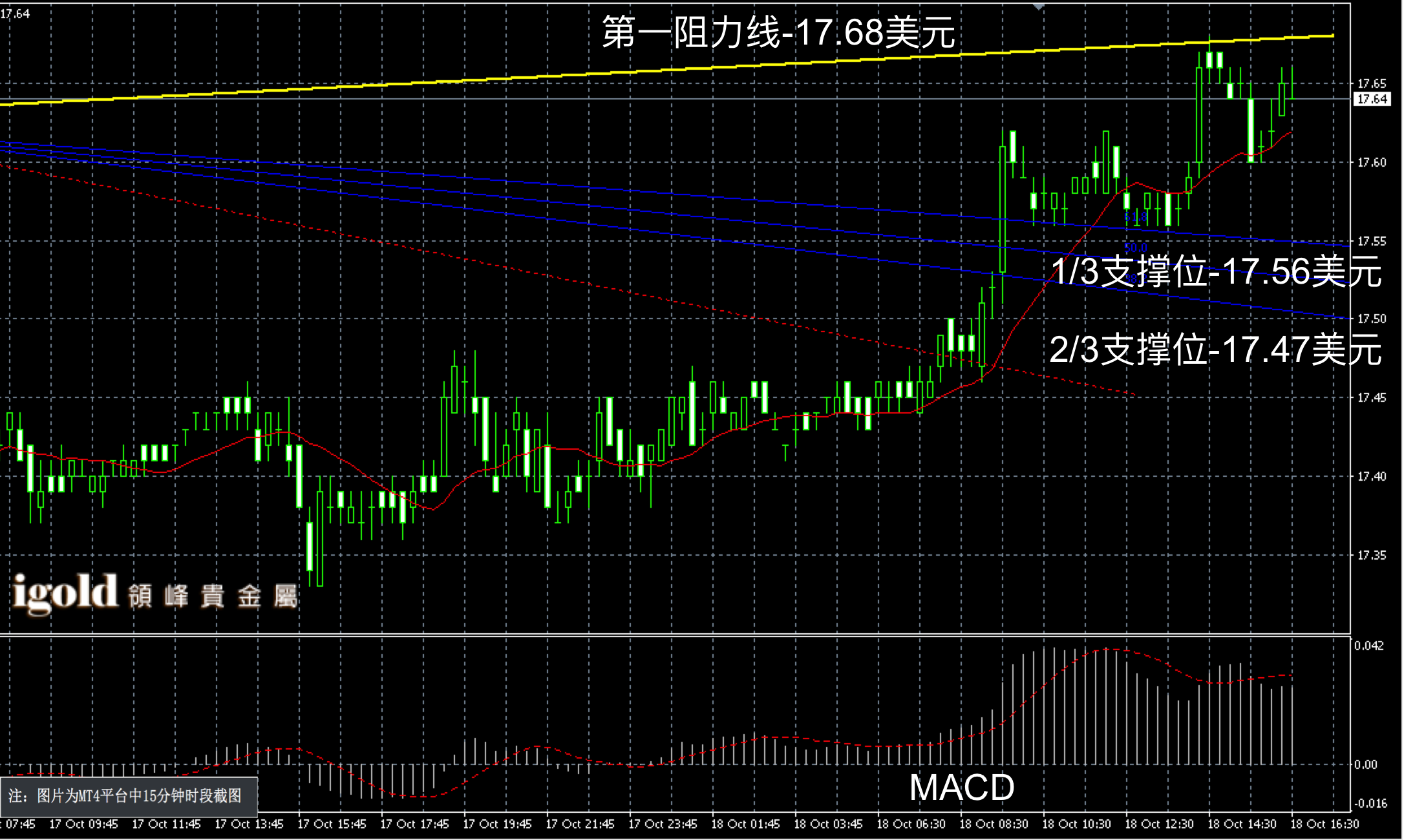 白银阴阳烛录得后期阳烛小幅反弹,末端高于红色日均线,短线MACD显示弱势多头主导,白银价格晚上或在17.65美元附近徘徊,高低多空扩大信号可分别参考17.75和17.55美元附近,白银价格若持续持稳在17.65美元以上,后期反弹的概率或上升。