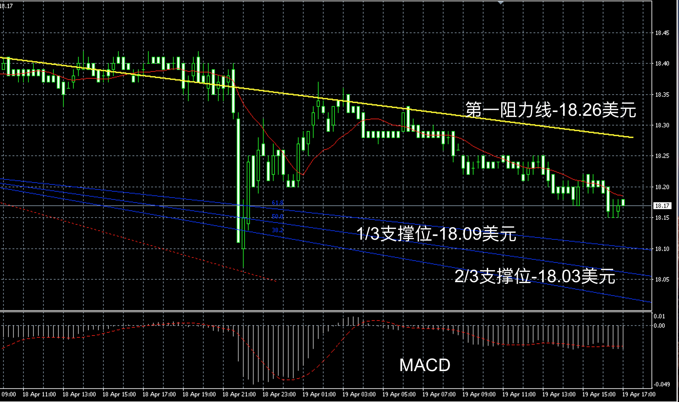 白银阴阳烛录得小幅回调,末端低于红色日均线中位,短线MACD显示弱势空头主导,白银价格晚上或围绕18.2美元附近震荡,高低多空扩大信号可分别参考18.31和18.09美元附近。