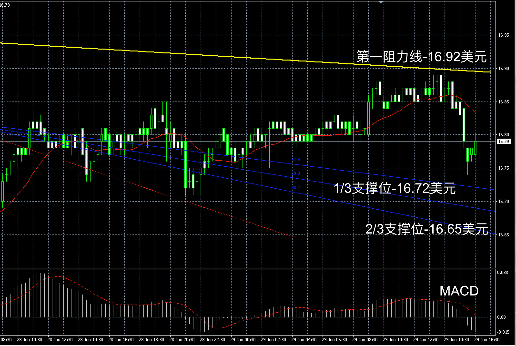 白银阴阳烛录得小幅回落,末端处于红色日均线中位,短线MACD显示弱势空头主导,白银价格晚上或围绕16.8美元附近弱势盘整,高低多空扩大信号可分别参考16.87和16.72美元附近。
