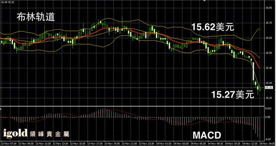 白银阴阳烛录得布林轨道急速下探,末端阴烛增多,且大幅低于红色日均线中位,短线MACD显示空头增加,白银价格短线或首先持稳15.3美元,美指若回望88.1,白银价格或下行至15.2美元附近。