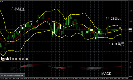 白银阴阳烛录得柱体聚焦在红色日均线中位,短线MACD显示呈中性,布林轨道区间收平,白银价格下午或继续围绕13.95美元震荡,高低多空信号可分别参考14和13.9美元附近,突破后可顺势小幅看涨看跌0.5美元左右。