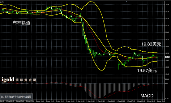 白银阴阳烛录得柱体较短,末端处于红色日均线中位,短线MACD显示弱势多头主导,布林轨道区间收平,白银价格下午或在19.7美元附近徘徊,高低多空扩大信号可分别参考19.85和19.56美元附近。
