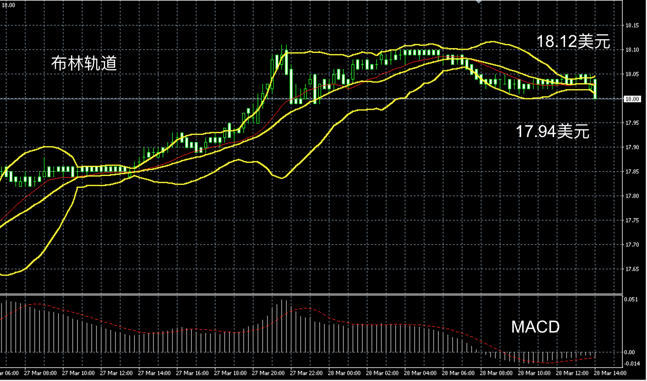 白银阴阳烛录得突破后柱体收短,末端处于红色日均线中位,短线MACD显示弱势空头主导,布林轨道区间收窄,白银价格下午或在18美元附近弱势盘整,高低多空扩大信号可分别参考18.06和17.95美元附近。