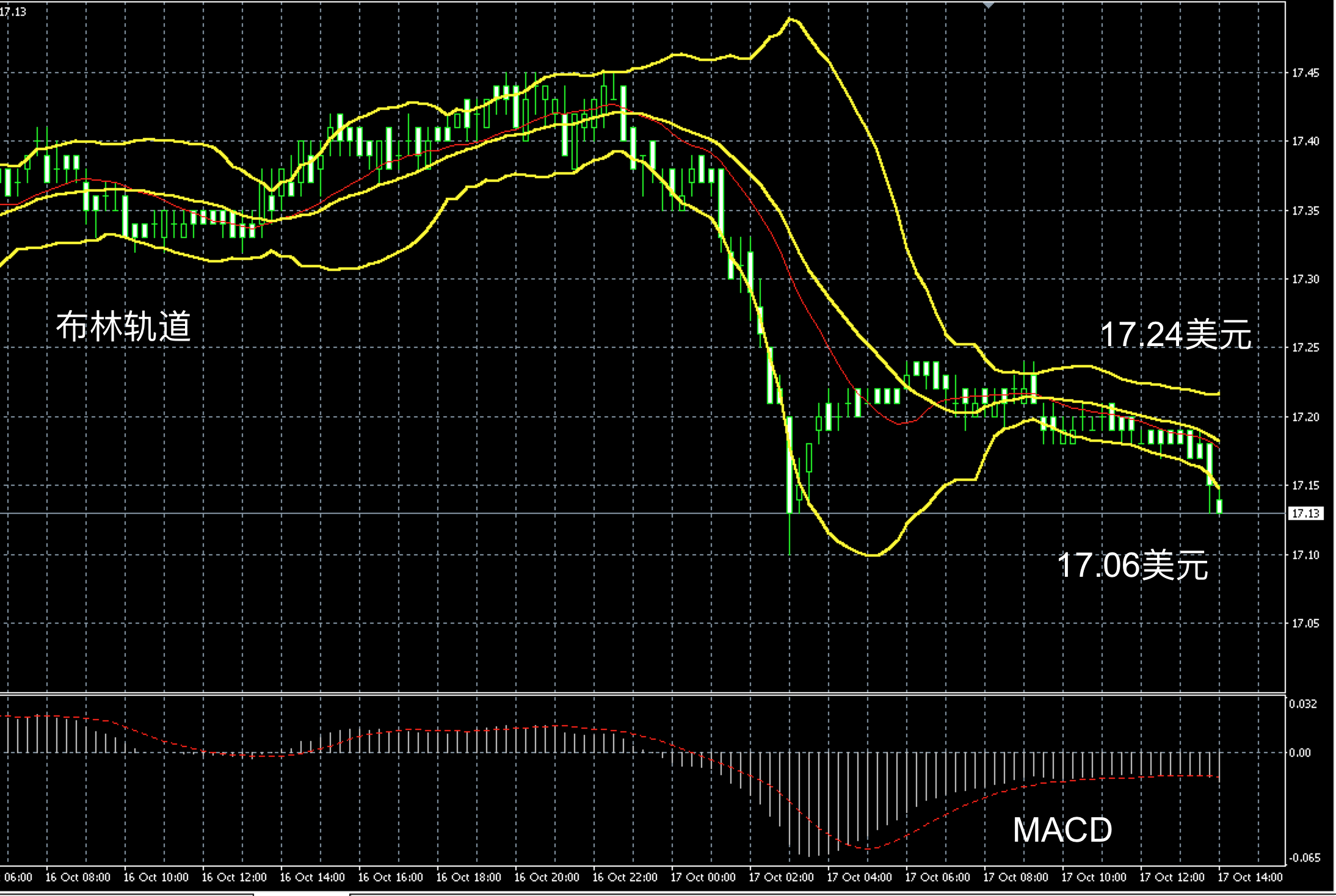 白银阴阳烛录得区间小幅回落,末端低于红色日均线中位,短线MACD显示弱势空头主导,布林轨道区间小幅收平,白银价格下午或在17.15美元附近弱势盘整,高低多空扩大信号可分别参考17.23和17.06美元附近。