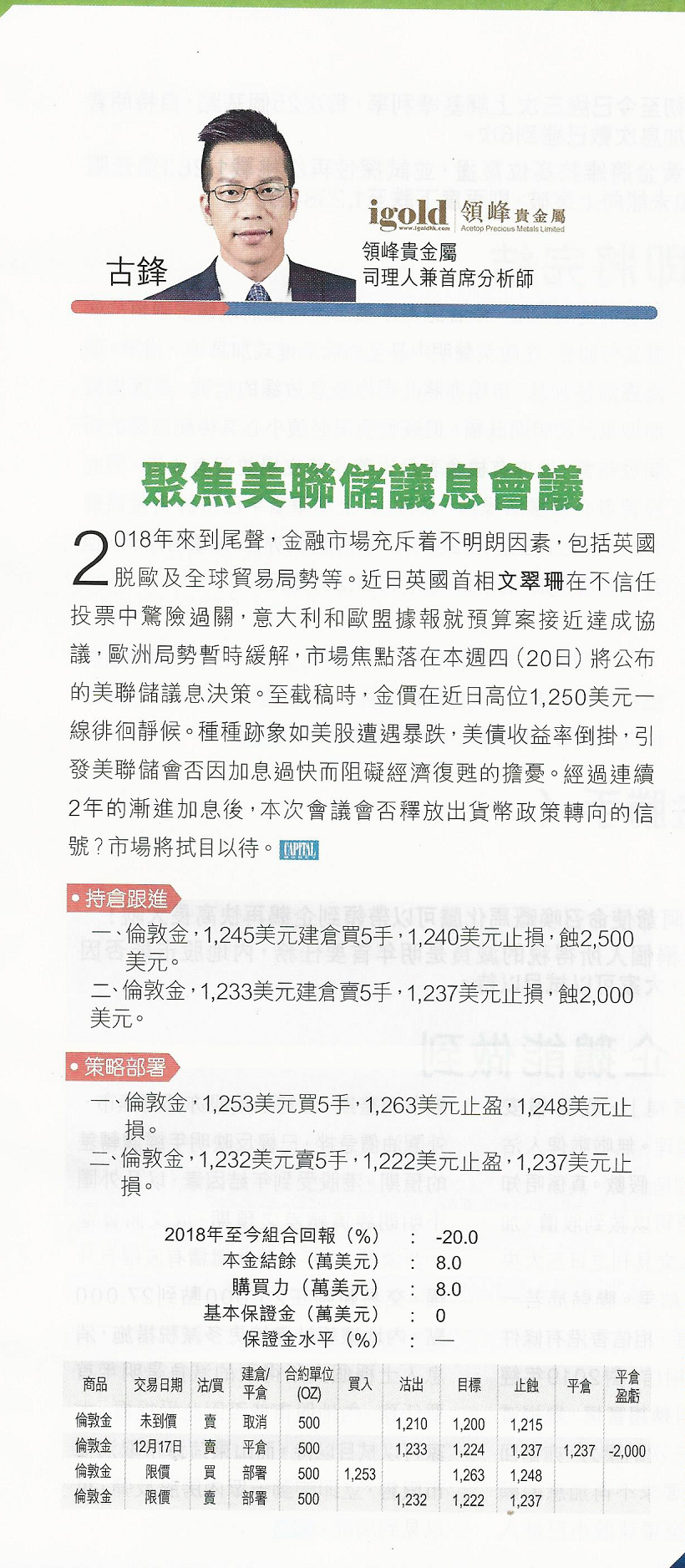 2018年来到尾声,金融市场充斥着不明朗因素,包括英国脱欧以及全球贸易局势等。近日英国首相文翠珊在不信任投票中惊险过关,意大利和欧盟据报就预算案接近达成协议,欧洲局势暂时缓解,市场焦点落在本周四(20日)将公布的美联储议息决策。至截稿时,金价在近日高位1,250美元一线徘徊静候。种种迹象如美股遭遇暴跌,美债收益率倒挂,引发美联储会否因加息过快而阻碍了经济复苏的担忧。经过连续2年的渐进加息后,本次会议会否释放出货币政策转向的信号?市场将拭目以待。