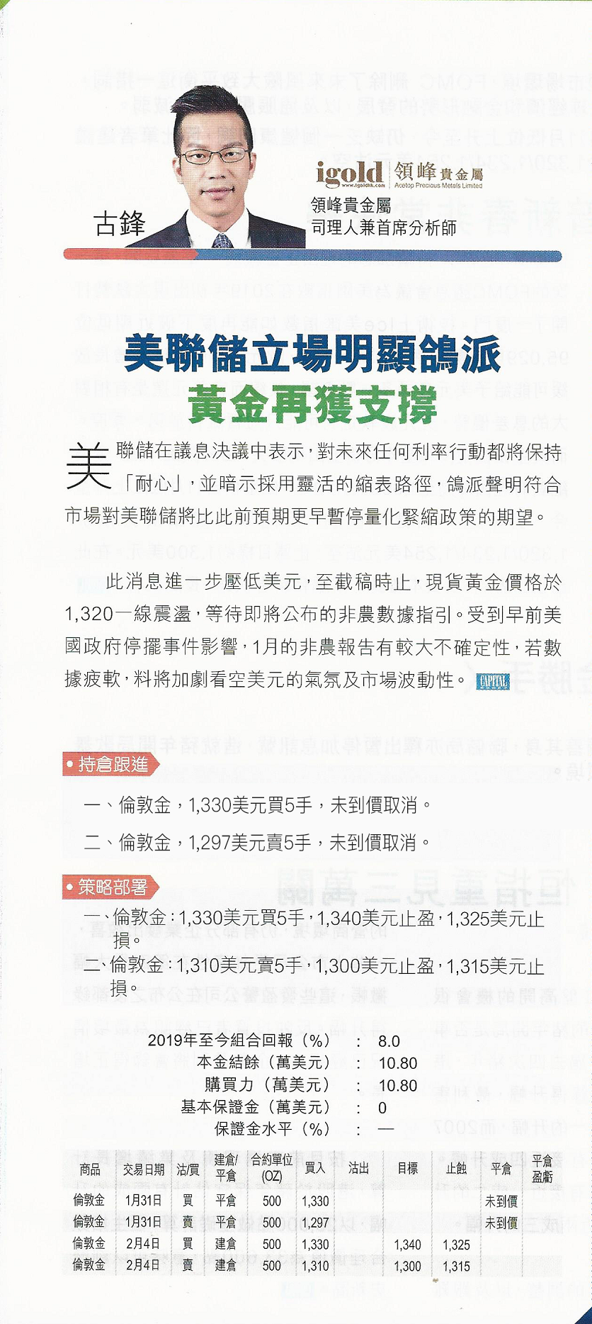 此消息进一步压低美元,至截稿时止,现货黄金价格于1,320一线震荡,等待即将公布的非农数据指引。受到早前美国政府停摆事件影响,1月的非农报告有较大不确定性,若数据疲软,料将加剧看空美元的气氛及市场波动性。