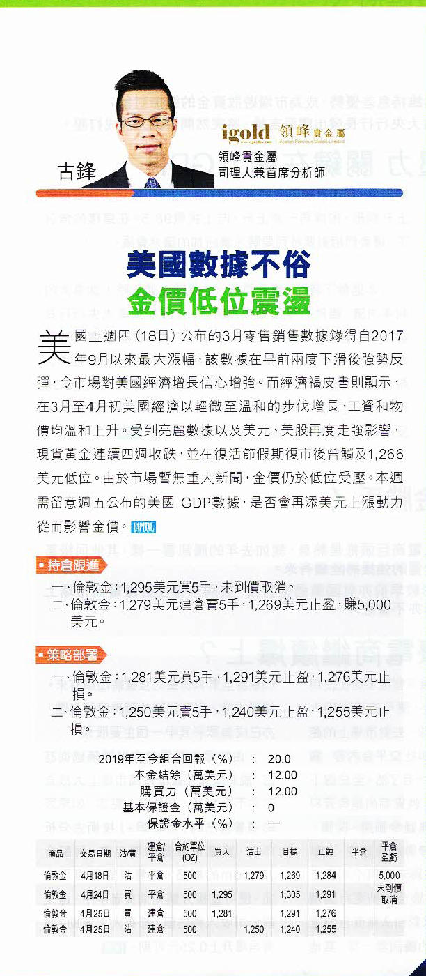 美国上周四(18日)公布的3月零售销售数据录得自2017年9月以来最大涨幅,该数据在早前两度下滑后强势反弹,令市场对美国经济增长信心增强。而经济褐皮书则显示,在3月至4月初美国经济以轻微至温和的步伐增长,工资和物价均温和上升。受到靓丽数据以及美元、美股再度走强影响,现货黄金连续四周收跌,并在复活节假期复市后曾触及1,266美元低位。由于市场暂无重大新闻,金价仍于低位受压。本周需留意周五公布的美国 GDP数据,是否会再添美元上涨动力从而影响金价。