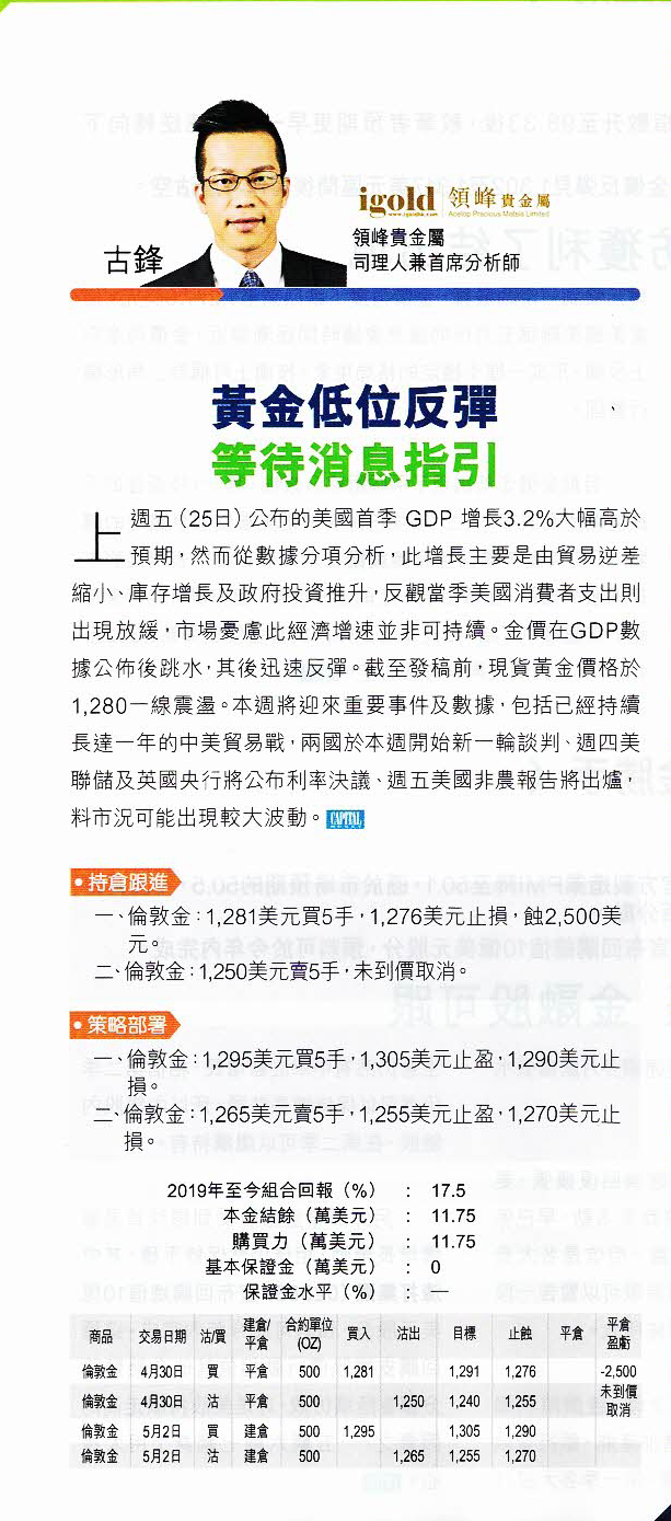 上周五(25日)公布的美国首季 GDP 增长3.2%大幅高于预期,然而从数据分项分析,此增长主要是由贸易逆差缩小、库存增长及政府投资推升,反观当季美国消费者支出则出现放缓,市场忧虑此经济增速并非可持续。金价在GDP数据公布后跳水,其后迅速反弹。截至发稿前,现货黄金价格于1,280一线震荡。本周将迎来重要事件及数据,包括已经持续长达一年的中美贸易战,两国于本周开始新一轮谈判、周四美联储及英国央行将公布利率决议、周五美国非农报告将出炉,料市况可能出现较大波动。
