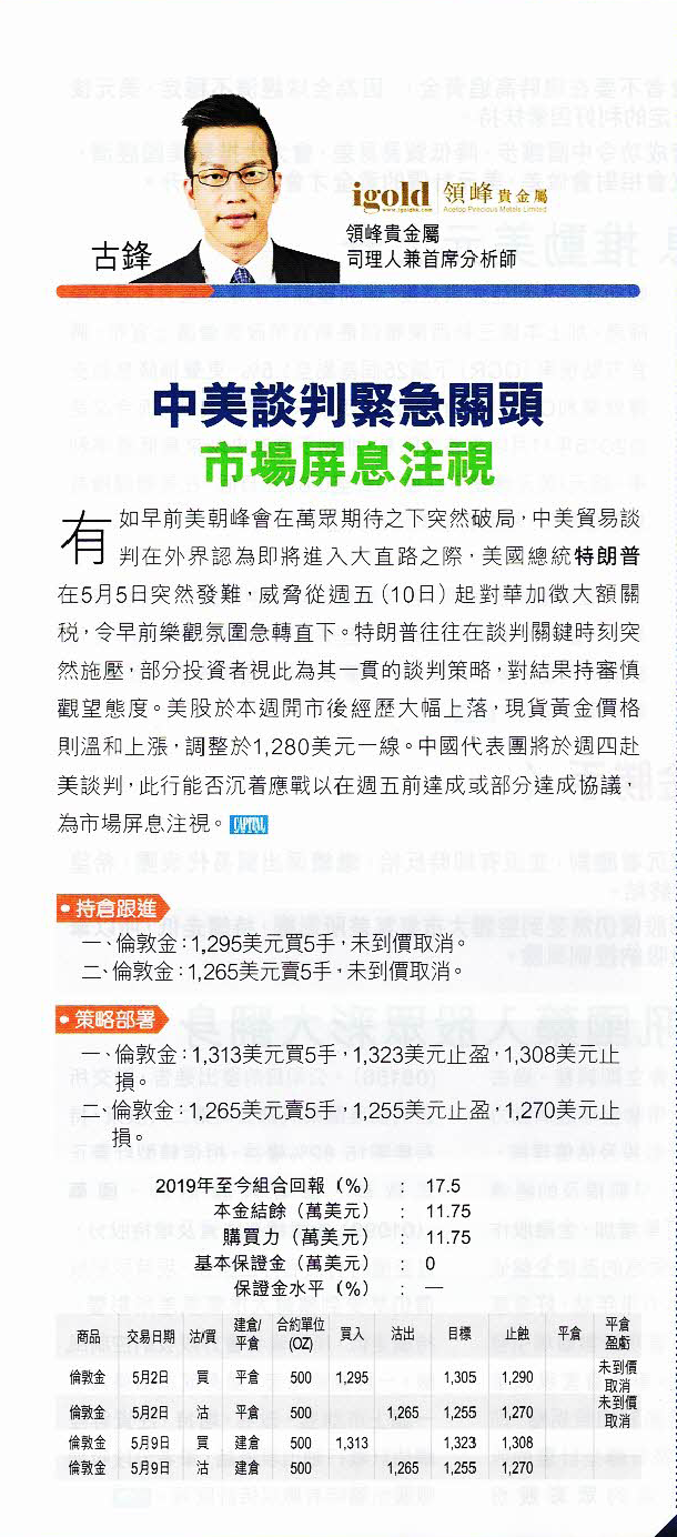 有如早前美朝峰会在万众期待之下突然破局,中美贸易谈判在外界认为即将进入大直路之际,美国总统特朗普在5月5日突然发难,威胁从周五起对华加征大额关税,令早前乐观氛围急转直下。特朗普往往在谈判关键时刻突然施压,部分投资者视此为其一贯的谈判策略,对结果持审慎观望态度。美股于本周开市后经历大幅上落,现货黄金价格则温和上涨,调整于1,280美元一线。中国代表团将于周四赴美谈判,此行能否沉着应战以在周五前达成或部分达成协议,为市场屏息注视。