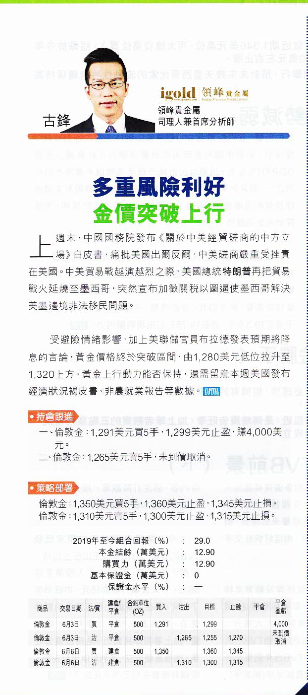 上周末,中国国务院发布《关于中美经贸磋商的中方立场》白皮书,痛批美国出尔反尔,中美磋商严重受挫责在美国。中美贸易战越演越烈之际,美国总统特朗普再把贸易战火延烧至墨西哥,突然宣布加征关税以图逼使墨西哥解决美墨边境非法移民问题。受避险情绪影响,加上美联储官员布拉德发表预期将降息的言论,黄金价格终于突破区间,由1,280美元低位拉升至1,320上方。黄金上行动力能否保持,还需留意本周美国发布经济状况褐皮书、非农就业报告等数据。