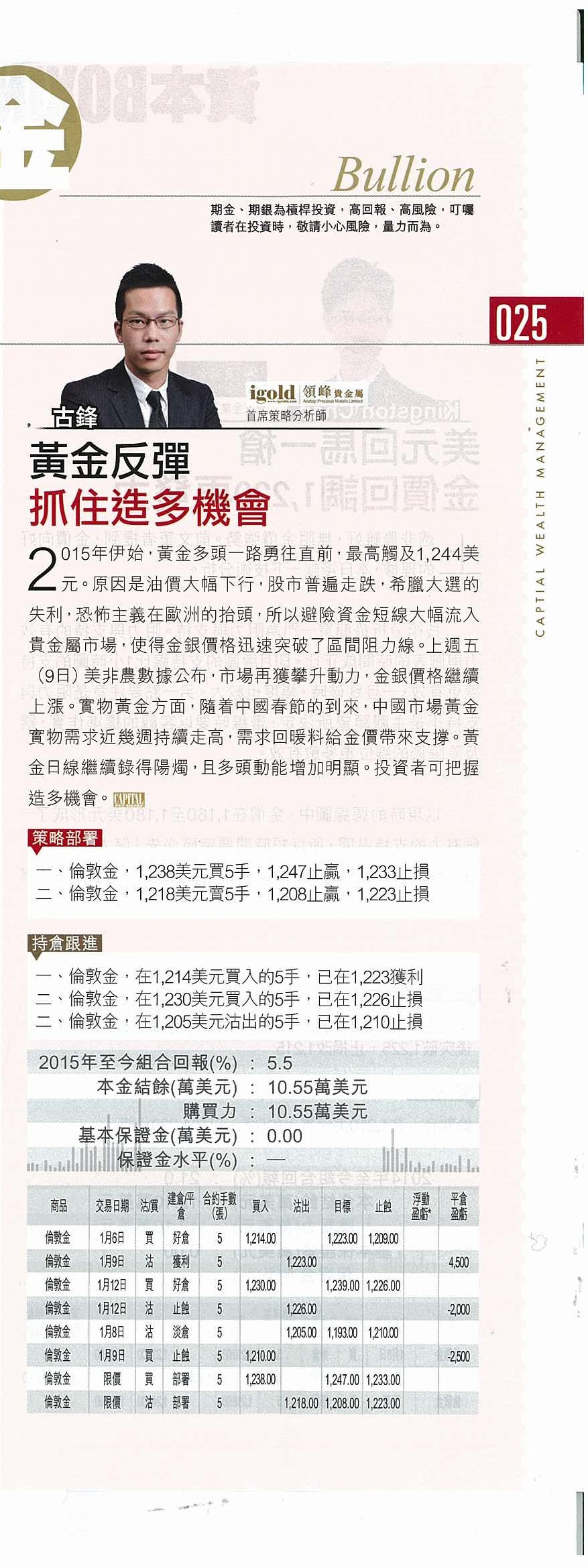 2015年伊始,黄金多头一路勇往直前,最高已触及1244美元,原因是油价大幅下行,股市普遍走跌,希腊大选的失利,恐怖主义在欧洲的抬头, 所以避险资金短线大幅流入贵金属市场,使得金银价格迅速突破了区间阻力线。上周五(9日)非农数据公布,市场再获攀升动力,金银价格继续上涨。