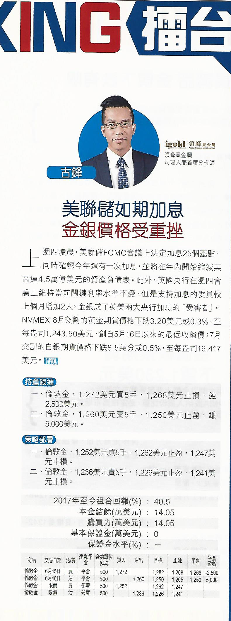 上周四凌晨,美联储FOMC会议上决定加息25个基点,同时确认今年还有一次加息,并将在年内开始缩减其高达4.5万亿美元的资产负债表。除此之外,英国央行在周四会议上维持当前关键利率水平不变,但是支持加息的委员较上个月增加了2人。金银成了英美两大央行加息的“受害者”。NVMEX 8月交割的黄金期货价格下跌3.20美元或0.3%,至每盎司1243.50美元,创下了自5月16日以来的最低收盘价;7月交割的白银期货价格下跌8.5美分或0.5%,至每盎司16.417美元。