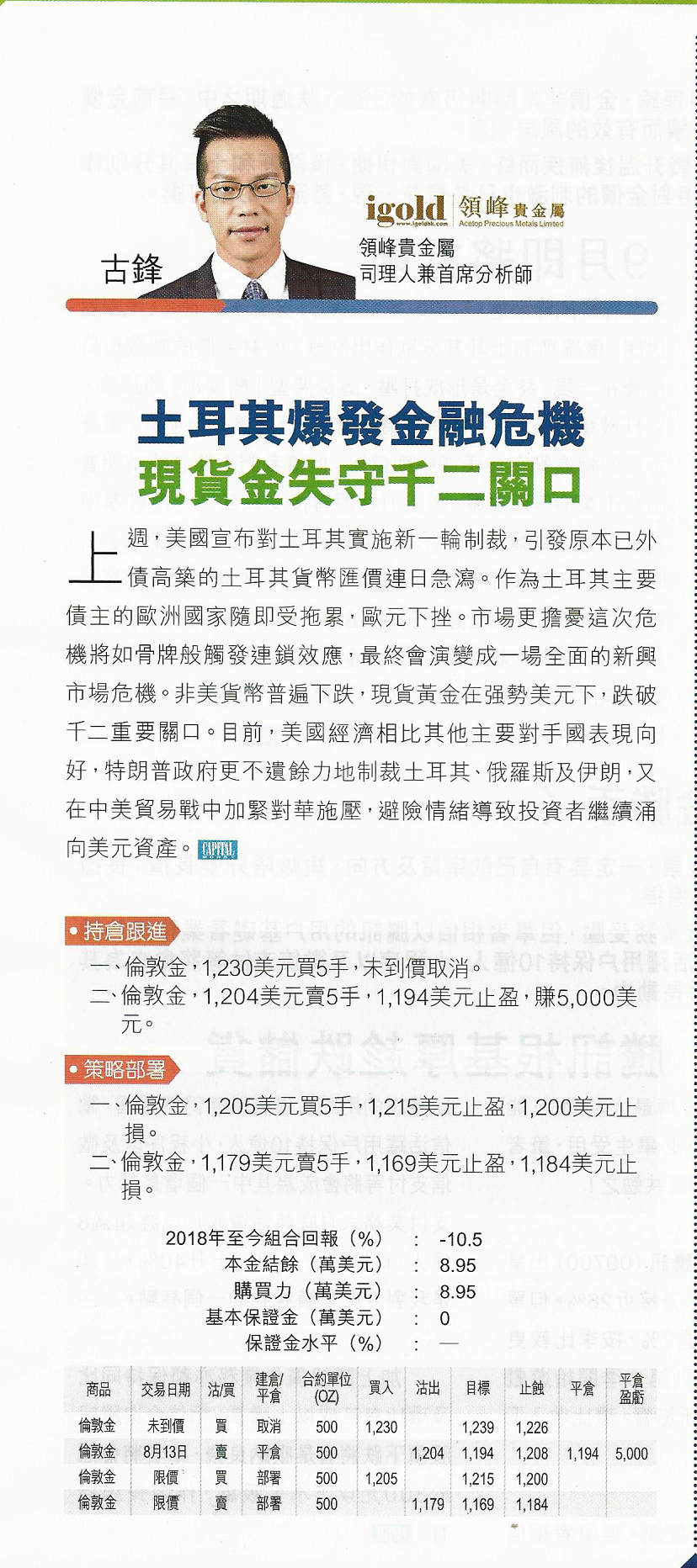 上周,美国宣布对土耳其实施新一轮制裁,引发原本已外债高筑的土耳其货币汇价连日急泻。作为土耳其主要债主的欧洲国家随即受拖累,欧元下挫。市场更担忧这次危机将如骨牌般触发连锁效应,最终会演变成一场全面的新兴市场危机。非美货币普遍下跌,现货黄金在强势美元下,跌破千二重要关口。