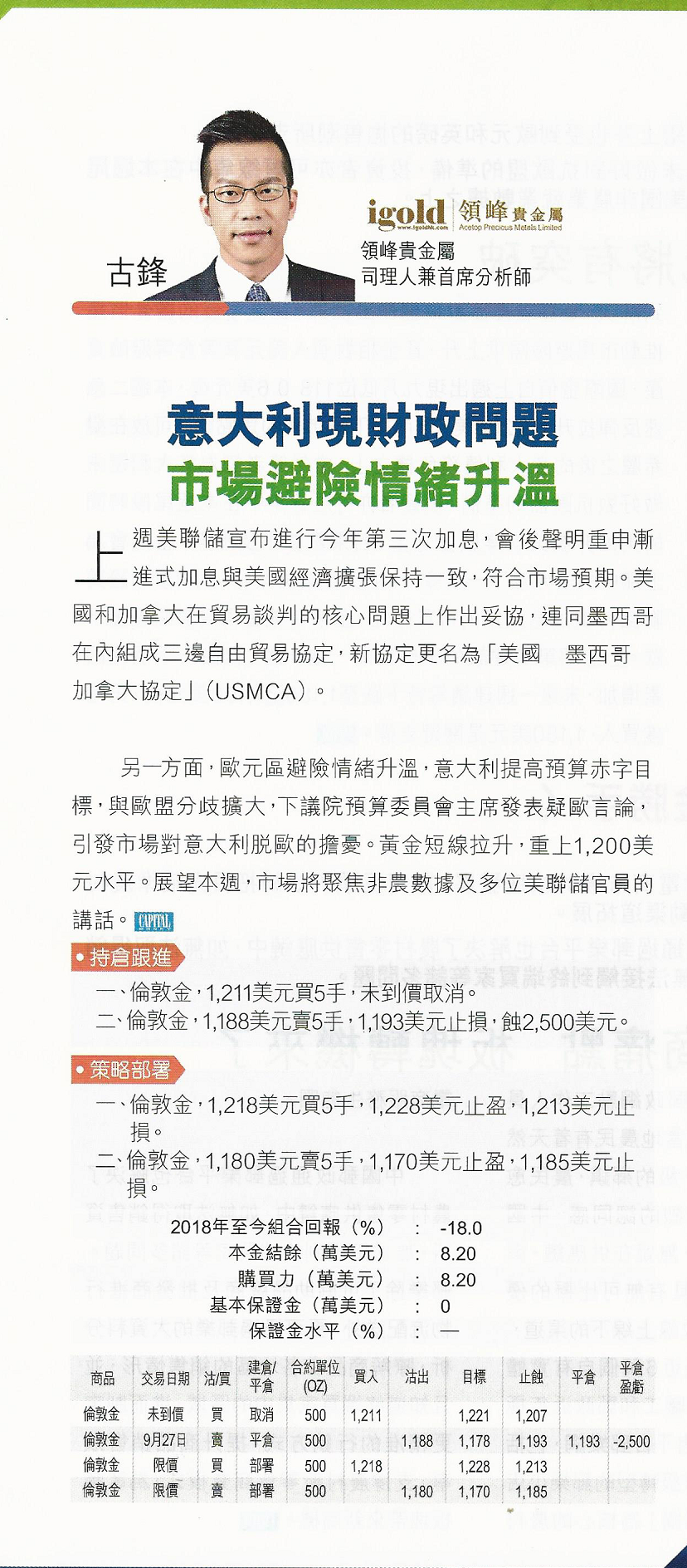 另一方面,欧元区避险情绪升温,意大利提高预算赤字目标,与欧盟分歧扩大,下议院预算委员会主席发表疑欧言论,引发市场对意大利脱欧的担忧。黄金短线拉升,重上1,200美元水平。展望本周,市场将聚焦非农数据及多位美联储官员的讲话。