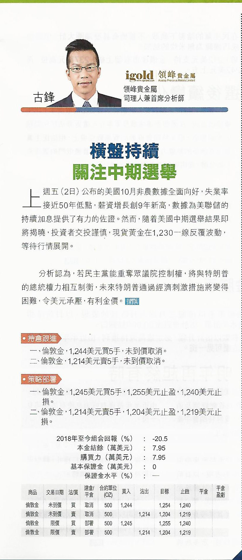 上周五(2日)公佈的美国10月非农数据全面向好,失业率为接近50年低点,薪资增长创9年新高,数据为美联储的持续加息提供了有力的佐证。然而随着美国中期选举结果即将揭晓,投资者交投谨慎,现货黄金在1,230一线反覆波动,等待行情展开。