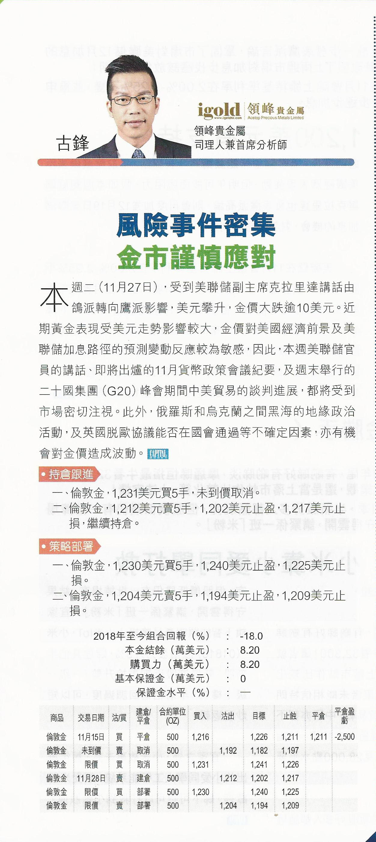 此外,俄罗斯和乌克兰之间黑海的地缘政治活动,及英国脱欧协议能否在国会通过等不确定因素,亦有机会对金价造成波动。