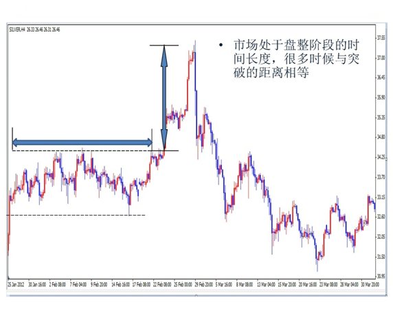 b.市场处于盘整阶段的时间长度,很多时候与突破的距离相等。