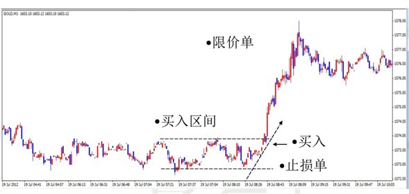 e.如果突破是向上的,多头控制了市场,在盘整的低位放置止损单;如果突破是向下的,空头控制了市场,则在盘整的高位放置止损单。