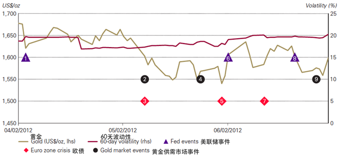 图表A- 1是黄金价格2012年第二季度价格走势和波动性比率图标,分析可得第二季度价格走势基本以下行为主,但是反弹强度也很大,末端区间盘整态势明显,整体波动性维持在20%不变,可见并未出现部分投资者所声称的“大幅下滑或落空前兆”。20%的波动性,无论股票市场还是债券市场都是比较常见的,且仍然处于相对平稳的阶段。 图A-1 2012年黄金价格走势和波动性比率