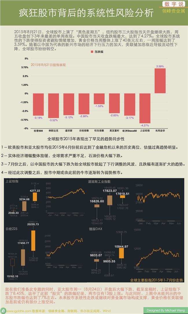 2015年8月21日,全球股市集体下跌,其中中国股市跌幅最大,上证综指收盘下跌了约4.27%。纽约股市三大股指创下3年来最差的单周表现,其中道琼斯指数当天下挫530.94点,收于16459.75点,跌幅为3.12%;纳斯达克指数跌幅为3.52%。当周道指累计下跌5.8%,创2008年10月10日以来最大单周跌幅;标普500指数累计跌5.8%,创2011年9月份以来最大单周跌;纳斯达克指数当周则累计下跌了6.8%。