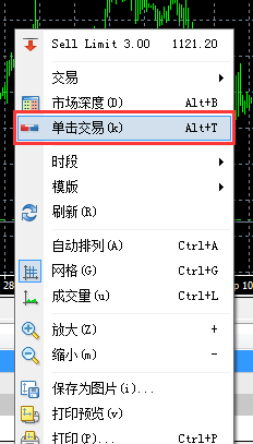 方式a、右键单击走势图接口,在弹出对话框中点击“单击交易”,接口左上角出现下单SELL/BUY图示,投资者点击即可下单,不需要再确认。