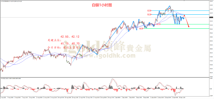 从白银1小时周期图看,银价达自42.95一线开始下跌最低达到41.15一线,跌幅达到1.80美元,交易重心出现下行,表明当前白银走势偏空。均线系统上,60均线下穿100均线,形成看空的死叉结构,表明白银处于空头的拐点区。操作上,顺当前走势,尝试逢高做空的操作思路,关注压力位42.12一线,如若在此震荡承压,可考虑布局空单,下行关注41.50一线,若下破,则空头进一步测试41.15的支撑位。