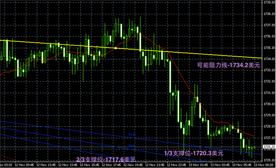 昨日概括:昨天市场在缺乏上行动力下有所下滑盘整,表现了金银目前缺乏进一步利好消息支撑的走势疲软。黄金日线浮动昨天从1734美元线震荡下行至1726美元线,最低黄金价格录得为1725.5美元/盎司;白银日线浮动则从32.6美元线附近震荡下行至32.3美元线附近,最低现货白银价格录得为32.21美元/盎司。市场同时受到欧元进一步走弱的拖累,在区间盘整中偏于下行。由于欧元区集团峰会并没有利好欧元,所以欧元继续下行,美指相对冲高,使得金银下行压力较大。