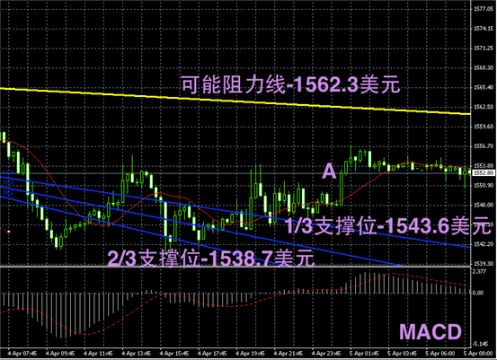 黄金阴阳烛录得柱体普遍收短,且整体处于红色日平均移动线中位,影线录得不明显,区间盘整态势明显。短线MACD显示多头或空头均不明显,短线支撑可首先参考阳烛A的最低价,若跌破或继续下行。