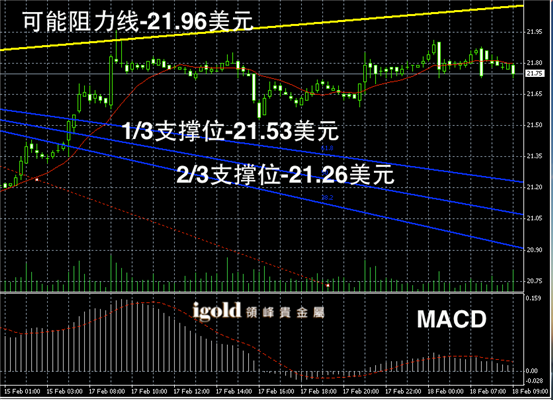 白银阴阳烛录得柱体聚焦明显,整体处于红色日平均移动线中位,短线MACD显示多头回落,白银价格在21.5 – 22美元区间的横盘震荡趋势明显。