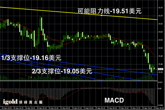白银阴阳烛录得整体偏空,后期柱体低于红色日平均移动线,短线MACD显示空头在不断增长,同时整体录得阴烛较多,白银价格或继续偏空下行。