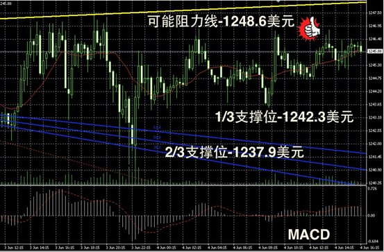 技术回顾:昨晚的评论中,我们反复论述了“金价或继续在1245美元线附近持稳”,从晚上至今天凌晨的走势再次印证了我们的研判。且金价在高位阻力线上,我们也给出了准确的预测值。