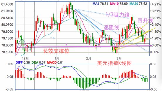 从图表中可以看出,美元指数走势已经触及长效的支撑位,未来继续下行很快会来到速阻线附近,即预计下周可能短暂下行后,美元指数即走入回升趋势,下周美元指数可能以78.6为拐点,扭跌为升。从目前美元指数整体趋势和阴阳烛录得走势来看,3月份波幅迹象加大,即下行穿过回升线后,可能继续小幅偏空走势,来到77.8 – 78.2 附近浮动,此后于速阻线附近遭遇长效支撑,回升至79附近,不过因阴阳烛录得比值偏大,未来可能走涨后有小幅下行趋势。