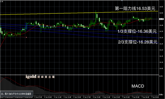 白银阴阳烛录得后期柱体较短,末端聚焦在红色日均线中位,短线MACD显示呈中性,白银价格上午或持稳在16.45美元附近,高低多空扩大信号可分别参考16.5和16.35美元附近。