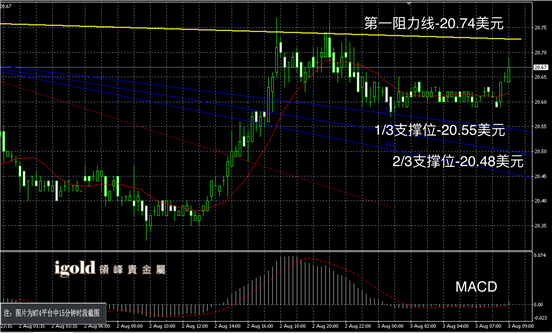 白银阴阳烛录得阴阳烛间隔出现,末端处于红色日均线中位,短线MACD显示呈中性,白银价格上午或在20.65美元附近徘徊,高低多空扩大信号可分别参考20.75和20.55美元附近,白银价格高位继续大幅反弹的概率较低。