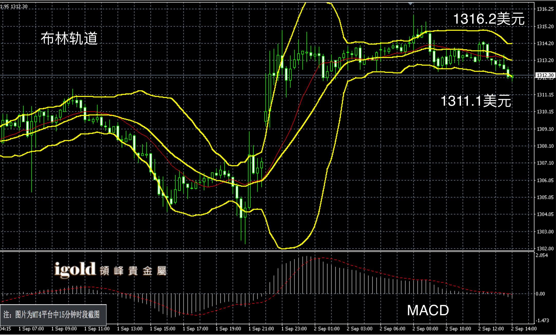 黄金阴阳烛录得后期阴烛小幅回落,末端低于红色日均线,短线MACD显示呈中性,布林轨道区间收窄,黄金价格下午或在1312美元附近弱势徘徊,高低多空扩大信号可分别参考1314.3和1310美元附近。